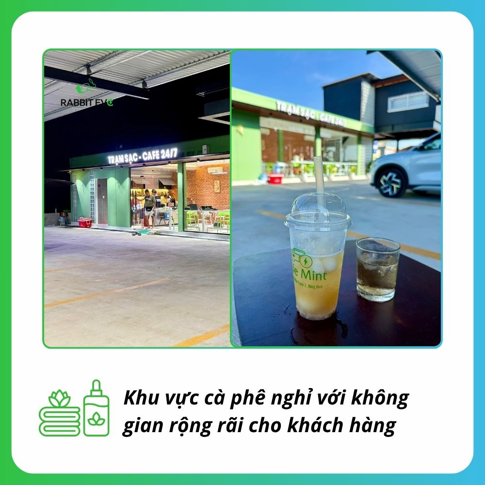 Điểm đặc biệt tại Quảng Ngãi là trạm sạc đặt trong khuôn viên quán cà phê MINT, mang đến không gian nghỉ chân tiện nghi cho khách hàng. Trong thời gian chờ sạc, người dùng có thể thưởng thức cà phê, làm việc hoặc thư giãn trong phòng máy lạnh rộng rãi.